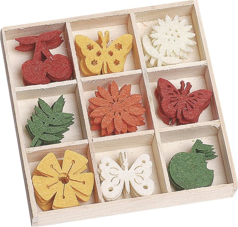 Filcové ozdoby vhodné pro dekorační zdobení, výrobu přání, dětskou tvorbu. Baleno v dřevěné krabičce 10,5 x 10,5cm. číst celé
