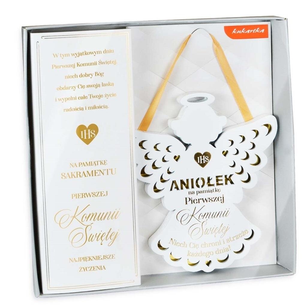 Zawieszka premium w formie Aniołka ZOP-010 to niezapomniany pomysł na prezent. Wykonana z solidnej płyty MDF z wyżłobionymi lustrzanymi zdobieniami oraz napisem w formie krótkiej sentencji. Na tylnej ściance aniołka jest tasiemka do zawieszenia na ścianie. Zawieszka zapakowana jest eleganckie i trwałe pudełeczko z życzeniami w środku, dodatkowo zabezpieczone folią pcv. Cechy szczególne: typ: zawieszka do powieszenia wielkość orientacyjna: wysokość: 14 cm, szerokość: 12,5cm (skrzydła), grubość: 7mm zdobienie: wzory wyżłobione w drewnie z lustrzaną folią, kolorowy napis okazja: Komunia