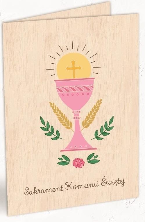 Karnet drewniany C6 Komunia kielich róż + koperta
