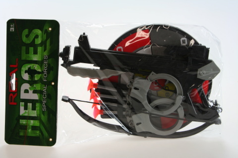 Sada obsahuje terč o průměru cca 19,5 cm,kuš o velikosti cca 28 cm se 4 šípy,pouta,pistolku o velikosti cca 27 cm.Vše z plastu.Věk 3+ číst celé