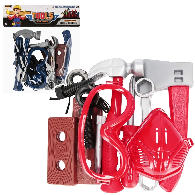 Stavební nářadí set, na výběr z více variant. Obsah setu je kladivo, šroubovák + 2 nástavce, brýle, maska, sekera, klíč, 2x deska, 2x šroub + nástavce. Cena je za 1 set. Má rozměr 21X24 cm. Vhodné pro děti ve věku 3+.
