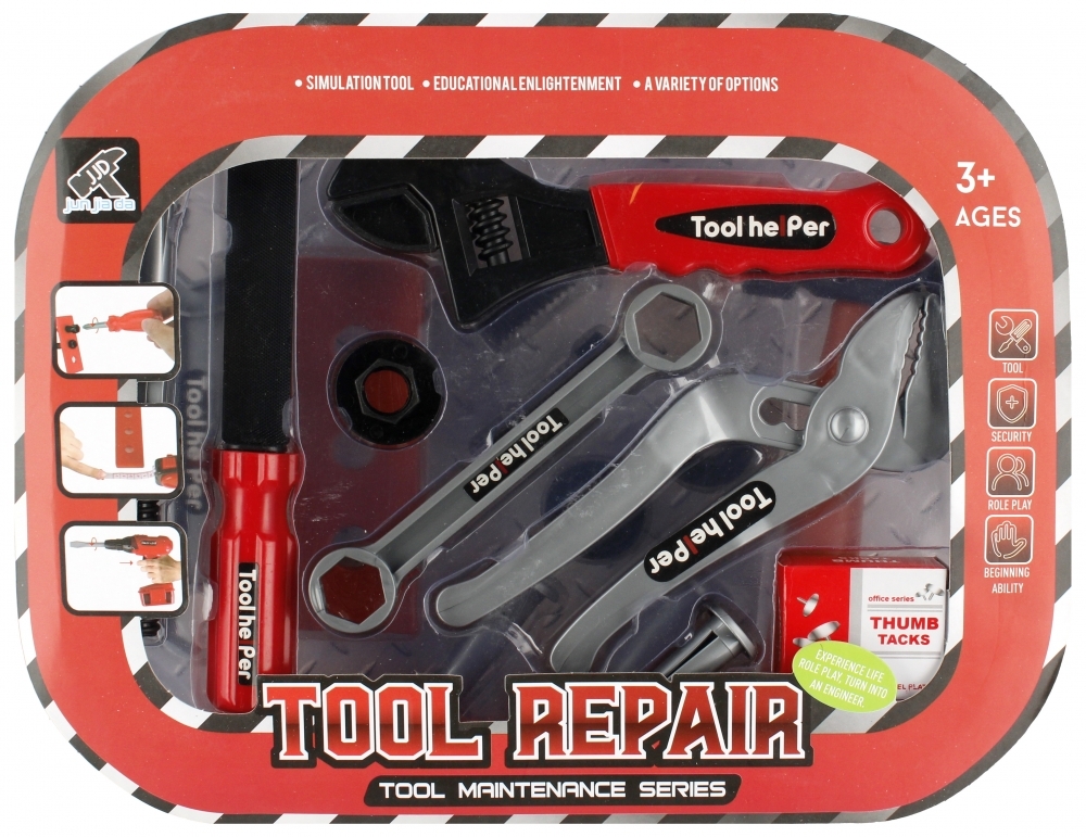 Zalety produktu: rozwija kreatywność dziecka, dziecko poznaje podstawowe narzędzia warsztatowe. Zestaw narzędzi MEGA CREATIVE to podstawowy element wyposażenia małego majsterkowicza. Dzięki niemu każde dziecko nauczy się jak przykręcać śrubki czy poprawnie używać wiertarki Zawartość zestawu: młotek, 3x klucz, 1x deseczka, 5x śrubka, 3x nakładka na śrubkę, pilnik wymienna nakładka, pinezki tapicerskie, klucz nastawny. Całość wykonana z plastiku. Wymiary/waga/baterie: wymiary produktu dł. x wys. x gł. cm -klucz nastawny 17x6x1,, wymiar opakowania dł. x wys. x gł. cm : 31x24x8, waga produktu bez opakowania kg : 0,19 kg, waga produktu w opakowaniu kg : 0,28 kg, nie wymaga zasilania bateriami. Produkt przeznaczony dla dzieci w wieku: 3 . Pakowany w plastikowym przezroczystym etui w kształcie walizki. Pakowanie w kartonie 24/48 szt.