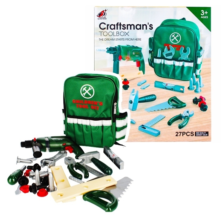 Obsah sady: batoh, šroubovák, prodlužovací rameno na šroubovák, dvě desky, ruční pilka, kladivo, klíč, kleště, vodováha, míra, šroubovák, 2 nástrčné šroubováky, 4 šrouby, 4 matice. Vše je vyrobeno z plastu a materiálu.
