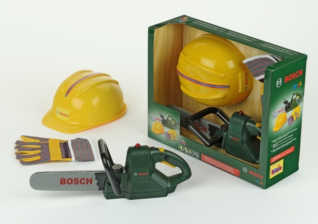Pracovní sada pro malé kutily. Sada obsahuje helmu, rukavice a motorovou pilu. Pila je doplněna zvukovými a světelnými efekty. Řetěz na pile se točí jako u skutečně motorové pily. Pila je na bterie 3xAA, které nejsou součástí balení. Vhodné pro děti od 3 let.