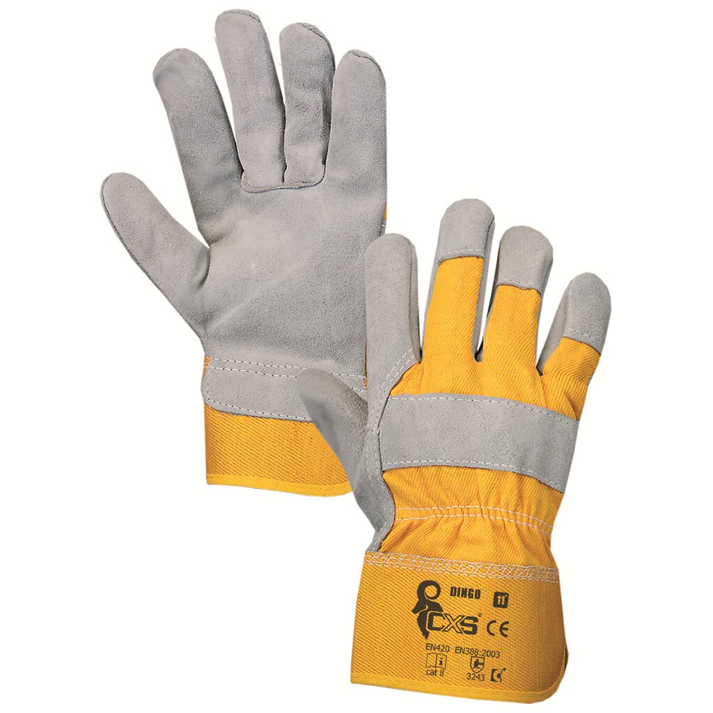 Kombinovaná kvalitní rukavice vyrobena z jednoho kusu silné kůže. Doporučené použití: všeobecné aplikace, montáž, terénní úpravy, údržba, kovoobrábění, hornictví, určeno pro suchá prostředí. Odvětví: stavebnictví, zemědělství. Rukavice z kvalitní šedé hovězí štípenky na dlani, hřbet v kombinaci kůže se žlutou tkaninou, tuhá manžeta s podšívkou ve dlani, vel. 11"