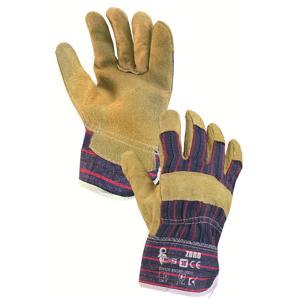 Rukavice s podšívkou ve dlani, žluté. Doporučené použití: určeno pro suchá prostředí. Odvětví: stavebnictví. Rukavice ze žluté hovězí štípenky, hřbet a manžeta z pruhované bavlněné tkaniny s podšívkou ve dlani, vel 10".