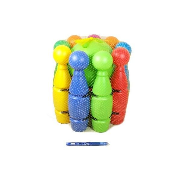 Plastové kuželky ve stojánku Kuželky jsou ideální pro rozvíjení zručnosti a obratnosti. Pro domácí i zahradní zábavu. Sada obasahuje: 9 ks kuželek, 1 koule Materiál: plast Hračka je vhodná pro děti od 3 let