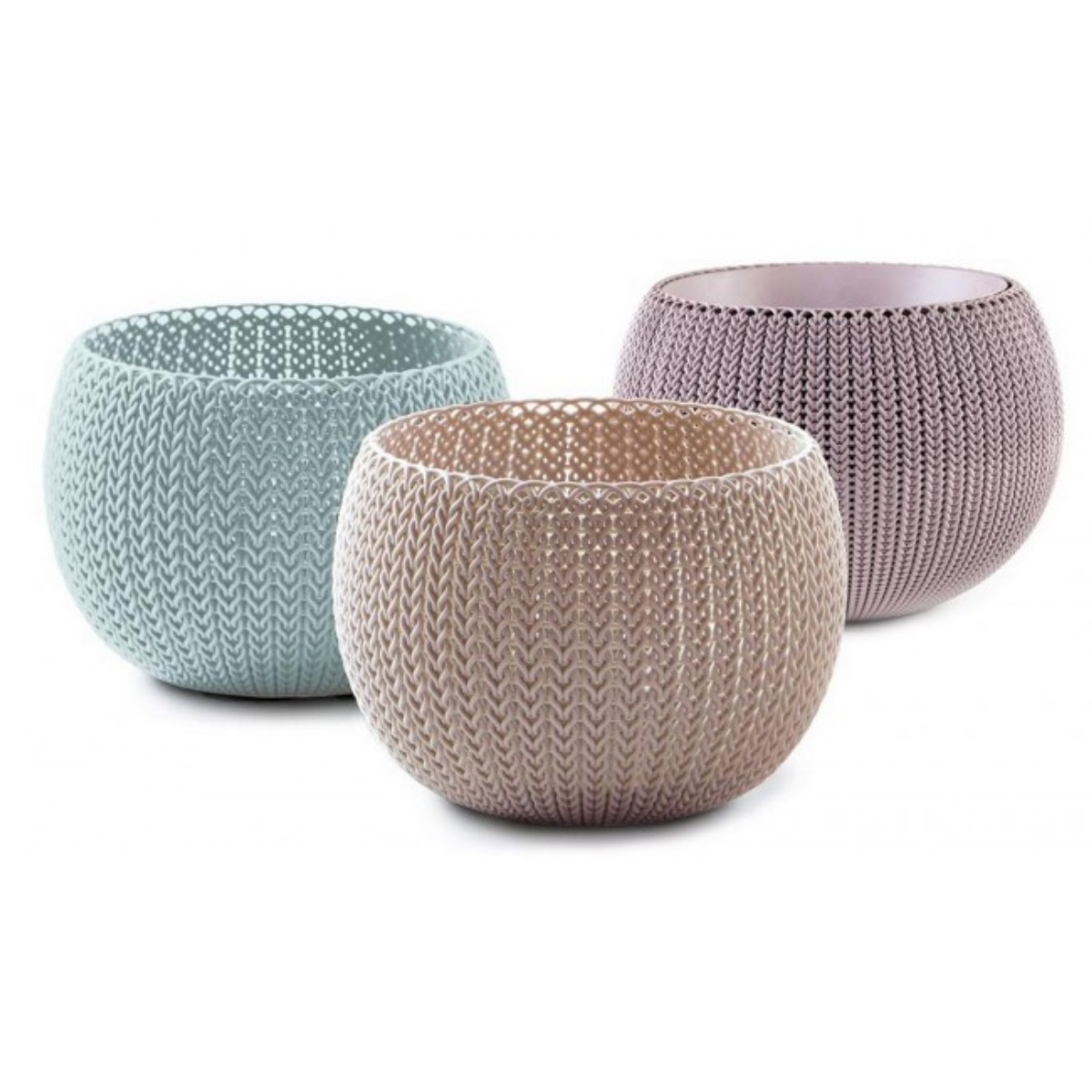 Sada 3 moderních plastových obalů na květináče v růžové, modré a béžové barvě, vhodné do interiéru i exteriéru, design inspirovaný pletením, odolné proti nepříznivému počasí i UV záření, snadná údržba, ideální pro bylinky do kuchyně, menší květiny a kapradiny a nebo pro sukulenty, rozměry 15x15x11 cm.