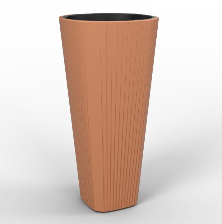 Moderní plastový květináč MUZA v barvě teraccota zaujme svým strukturovaným povrchem a zajímavým tvarem, který působí luxusně a jedinečně. Díky čtvercovému půdorysu spodní části snadno stabilně stojí a perfektně doplní každý prostor, ať už doma, na terase nebo balkónu.