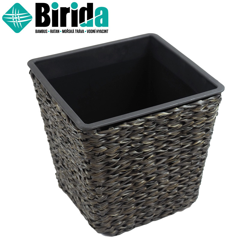 Plastový čtverhranný květináč oplétaný tmavým vodním hyacintem - typu plast.Čtvercová základna, barva - tmavá, vnitřní plastový korpus - černý.Tato varianta květináčů je určena pro použití v interiéru i exteriéru (venkovní použití)!