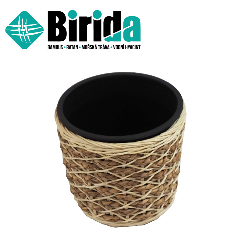 Plastový květináč oplétaný kombinací mořské trávy a ratanu. Kruhový průměr, těsné oplétání.