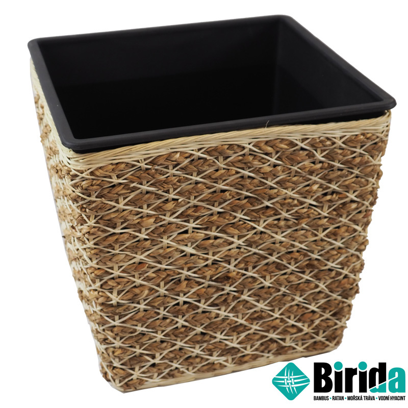 Plastový čtverhranný květináč oplétaný kombinací mořské trávy a ratanu. Čtvercová základna, těsné oplétání, barva - přírodní světlá.