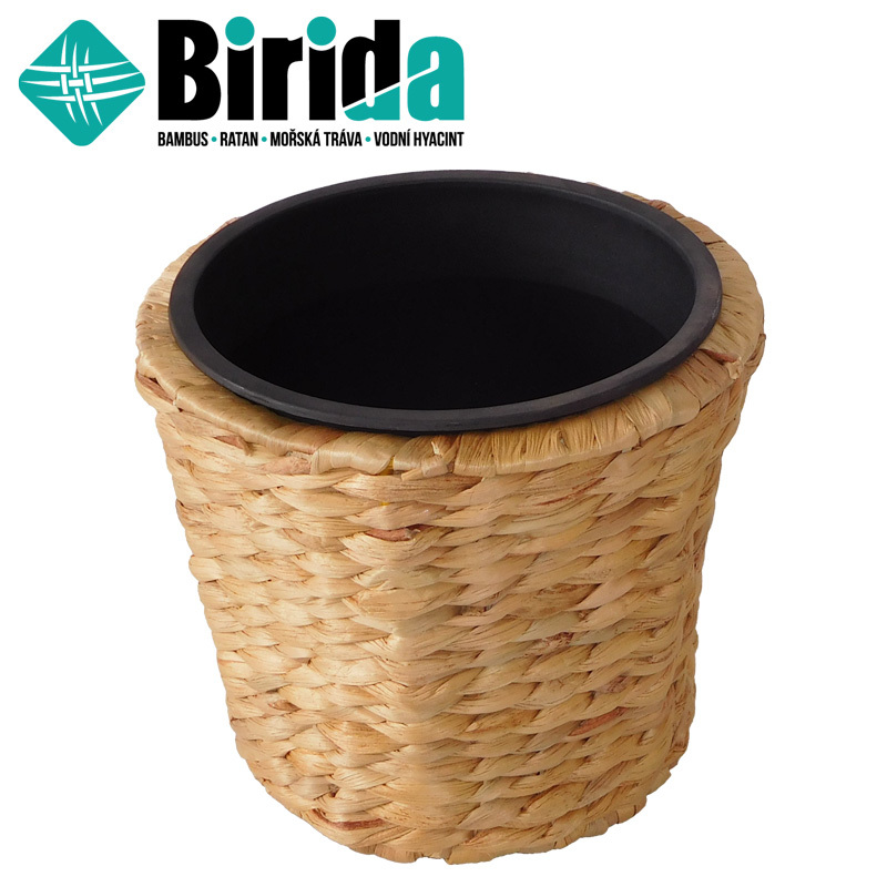 Plastový květináč oplétaný vodním hyacintem. Kruhový průměr květináče, vyztužený kovovým rámečkem, barva - přírodní světlá, vnitřní plastový korpus - černý. číst celé