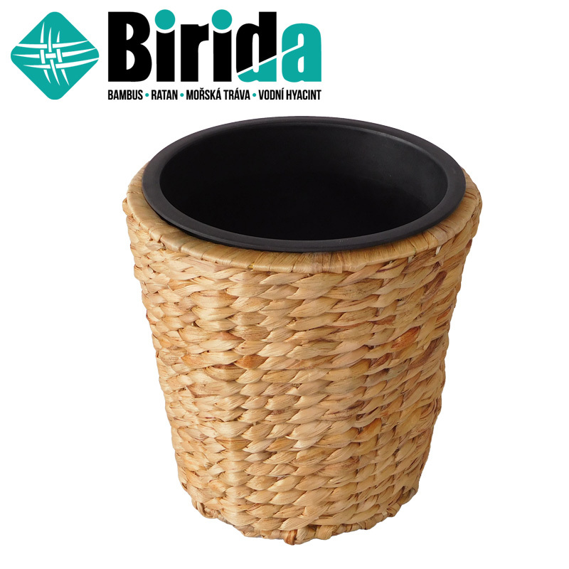 Plastový květináč oplétaný vodním hyacintem. Kruhový průměr květináče, vyztužený kovovým rámečkem, barva - přírodní světlá, vnitřní plastový korpus - černý. číst celé