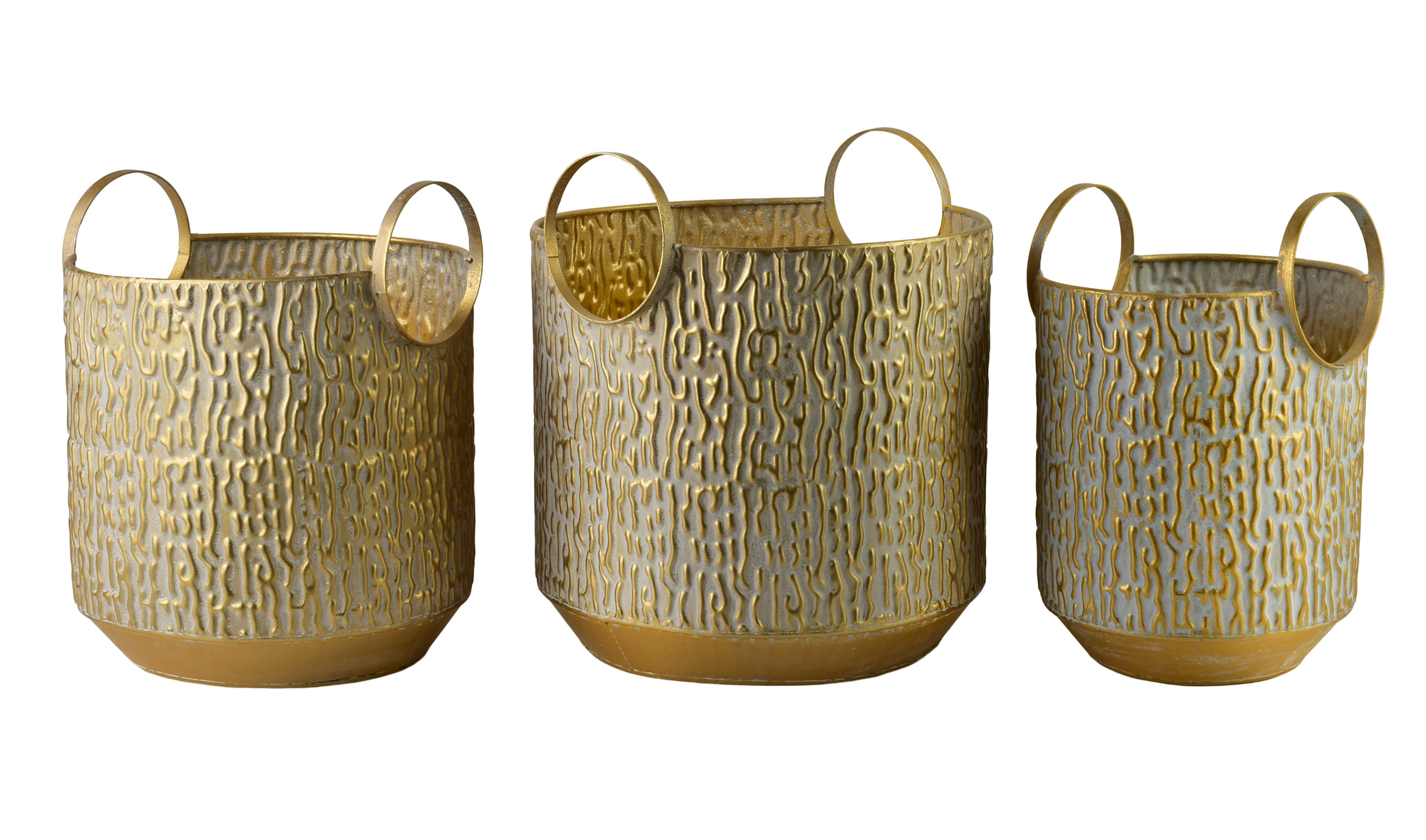 Komplet 3 osłonek VINTAGE GLOWMateriał: metalWykończenie: złote, matoweStyl: elegancki, ponadczasowy, pasujący do wnętrz glamour, klasycznych i nowoczesnychZastosowanie: osłonki na doniczki, element dekoracyjny na półkę, stolik czy komodę.Tego typu zestaw sprawdzi się zarówno do eksponowania roślin, jak i jako ozdoba sama w sobie. Złote, matowe wykończenie dodaje wnętrzu ciepła i elegancji, a metalowa konstrukcja zapewnia trwałość.XL 33X32X30/36CM z uchwytamiL 27x27x29/35cmM 22x22x27/33cm