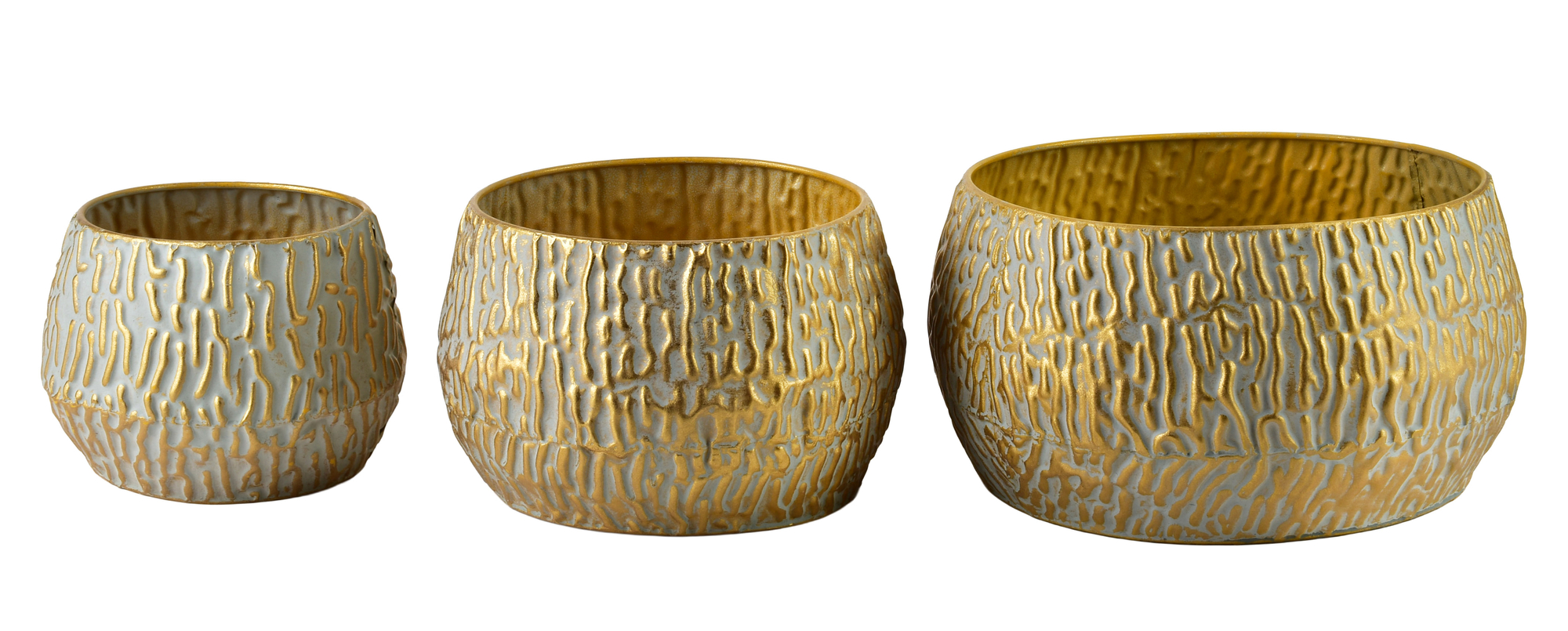 Komplet 3 osłonek VINTAGE GLOWMateriał: metalWykończenie: złote, matoweStyl: elegancki, ponadczasowy, pasujący do wnętrz glamour, klasycznych i nowoczesnychZastosowanie: osłonki na doniczki, element dekoracyjny na półkę, stolik czy komodęTego typu zestaw sprawdzi się zarówno do eksponowania roślin, jak i jako ozdoba sama w sobie. Złote, matowe wykończenie dodaje wnętrzu ciepła i elegancji, a metalowa konstrukcja zapewnia trwałość.XL: 26x31x17cmL: 20x24x16cmM: 15x19x15cm