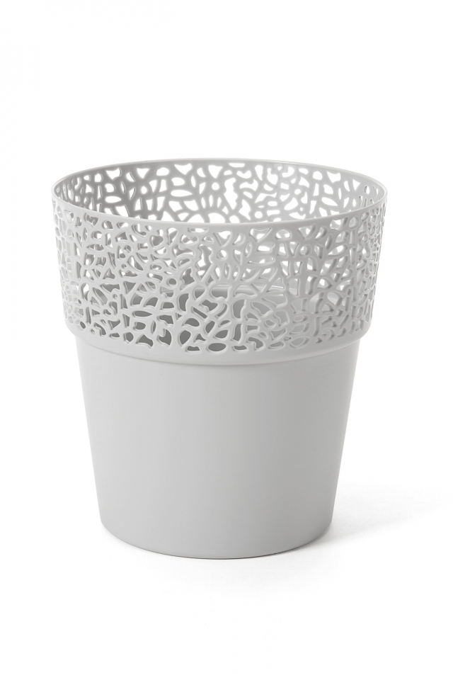 Plastový květináč Rosa s krajkou v jemných pastelových barvách. Barva: světle šedá Rozměr: výška 195 mm průměr 170 mm