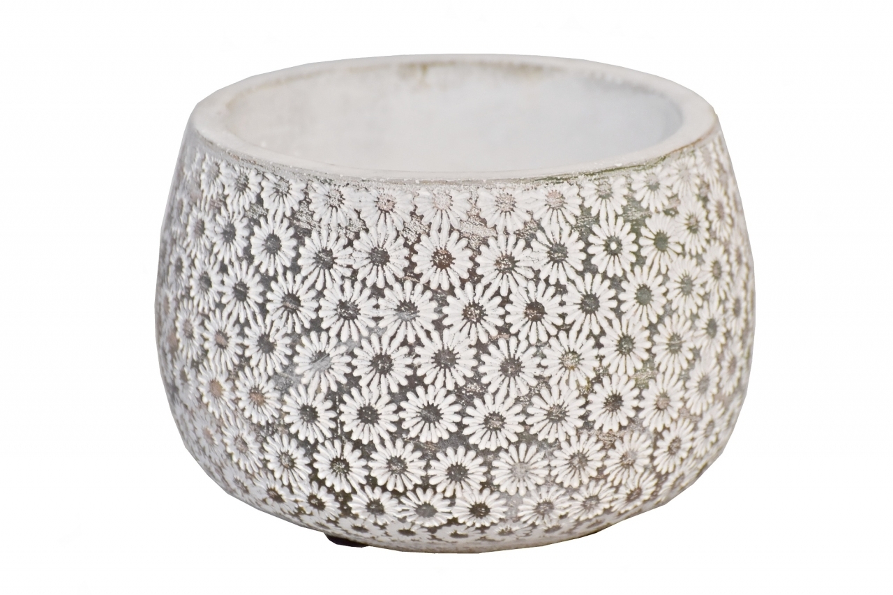 Moderní květináč s reliéfem drobných bílých kopretin na pokojové květiny i do zahrady. Květináče jsou vyrobené z cementovo-pryskyřičné směsi, takže je docela těžký a jen tak se nepřevrátí. Květiníč není mrazuvzdorný.