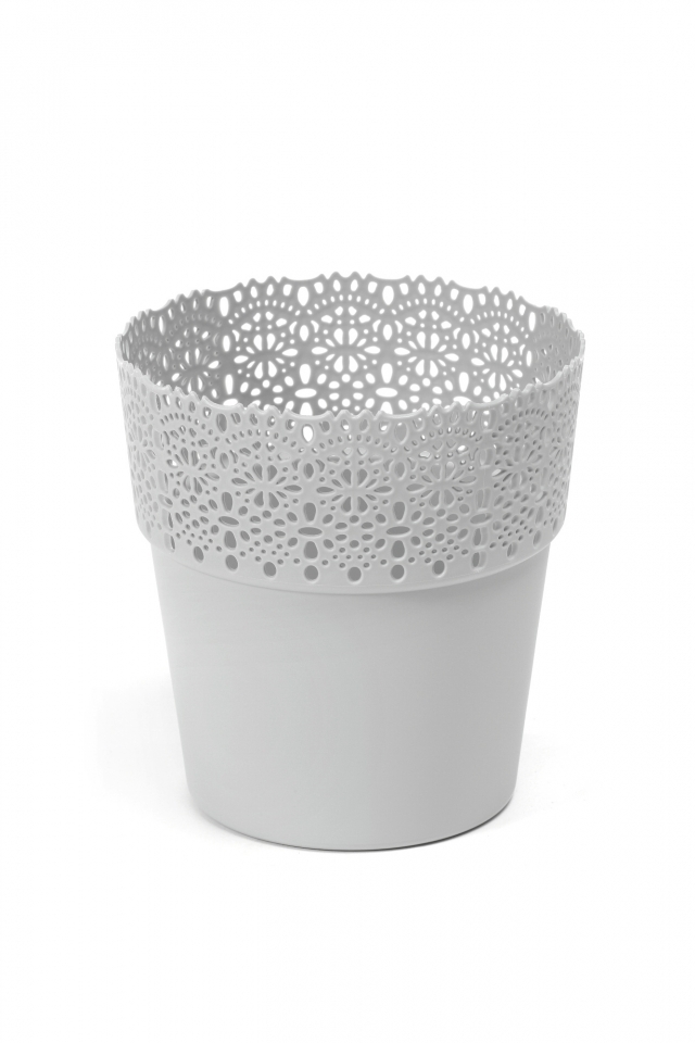Plastový květináč Bella s květinovou krajkou v jemných pastelových barvách.