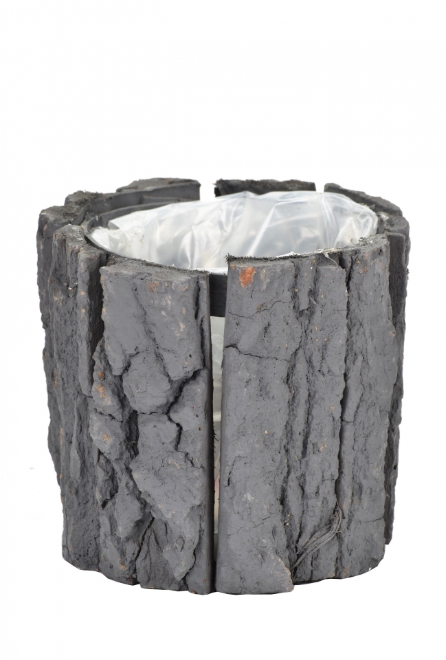 Dřevěný květináč z kůry. Součístí květináče je igelitová výplň.