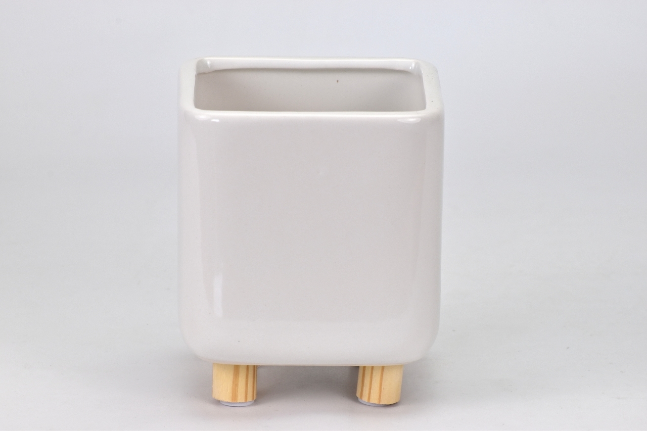 Bílý keramický květináč na dřevěných nožkách. II. jakost z důvodu různých vad v glazuře - nedoglazurované tečky, střečená barva, uštípnutá glazura, hrbolky. Každý květináč má jinou vadu. Tyto vady nejsou důvodem k reklamaci.