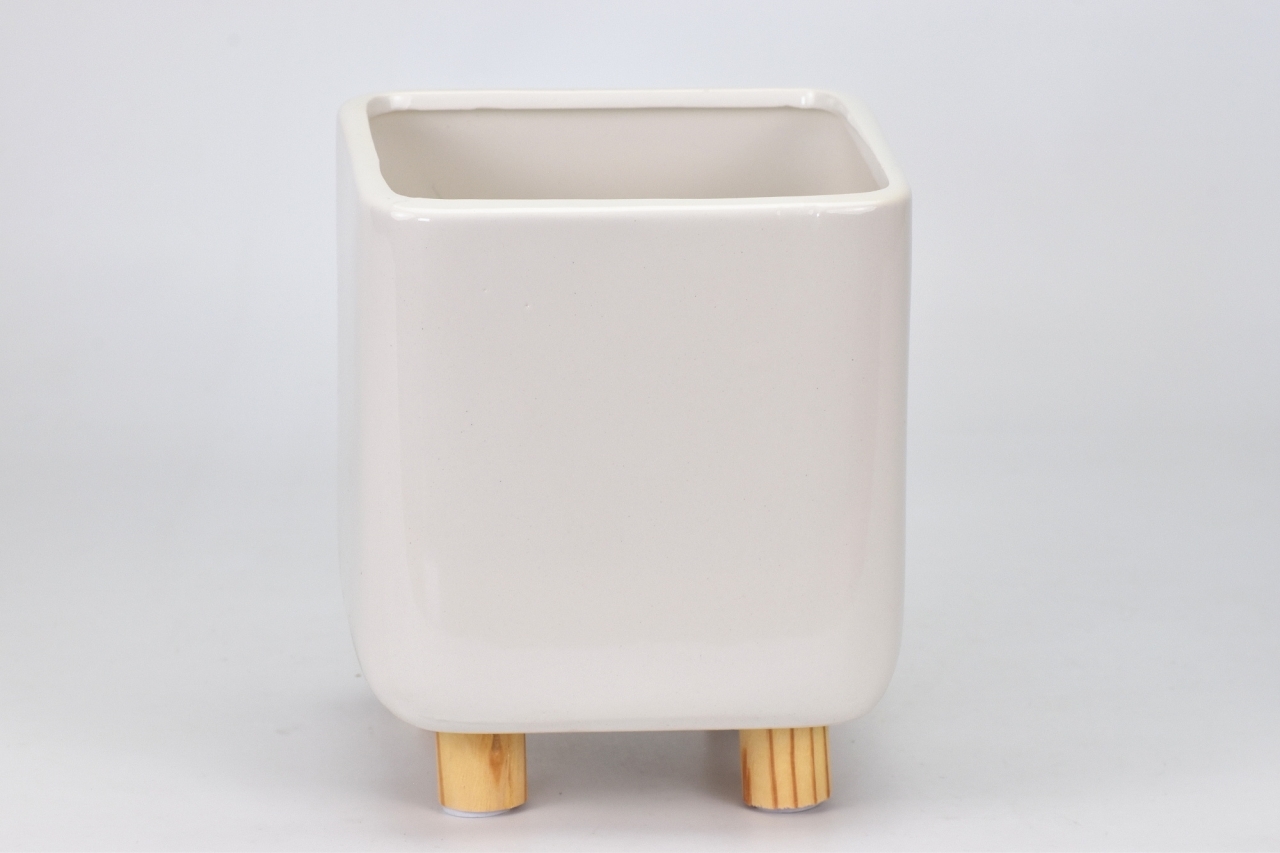 Bílý keramický květináč na dřevěných nožkách. II. jakost z důvodu různých vad v glazuře - nedoglazurované tečky, střečená barva, uštípnutá glazura, hrbolky. Každý květináč má jinou vadu. Tyto vady nejsou důvodem k reklamaci.