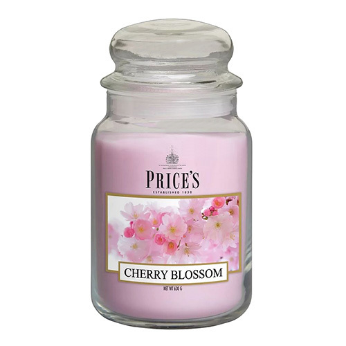 Lehká vůně a bledě růžová barva zachycuje půvab a jemnost třešňového květu. Krása tohoto květu je široce obdivována po celém světě. Jemná, ovocná květinová vůně.Price\'s Candles se sídlem v Bedfordu si udržuje své britské dědictví, které spravuje veškerý vývoj, prodej a distribuci produktů. Price\'s Candles produkují dlouhotrvající svíčky od doby, kdy byla v roce 1830 založena společnost. Zatímco svět svíček se od té doby značně změnil, jejich slib vyrábět vysoce kvalitní a nádherně vonné svíčky zůstává stejný, jako kdysi. Společnosti Price\'s Candles byla v roce 1850 udělena Královská záruka jako svíčkaři pro Její Veličenstvo královnu a začala zásobovat svíčkami všechny královské příležitosti.V roce 1991 je výroba přesunuta do nejmodernější továrny v italském Turíně. Kompletně s dvěma laboratořemi a pokročilými technologiemi, umožňuje Price\'s Candles pokračovat ve vývoji a výrobě nejkvalitnějších a nejinovativnějších svíček. Prostřednictvím experimentů dokážou Price\'s Candles vytvořit různé druhy čistšího, kvalitnějšího parafinového vosku, který se dodnes používá ve výrobě svíček v rámci společnosti. Tento parafinový vosk má vysokou teplotu tání, což z technického hlediska činí nejlepší vosk pro výrobu svíček.Dopřejte si vysokou kvalitu a nádhernou vůni interiéru!Doba hoření 110 - 150 hodin.Hmotnost: 630 g.