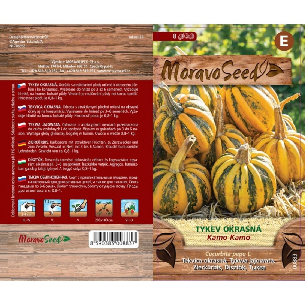 Tykev Kamo Kamo je původem z Nového Zélandu. Plodí krásné tmavě zelené plody s podélnými žlutými až oranžovými pruhy. Typické je výrazné žebrování. Dýně dorůstají do váhy 0,8-1 kg, mají pevnou slupku a lze je dlouhodobě skladovat. Někdy je tato dýně považována za výlučně okrasnou odrůdu. Její plody jsou ale velice chutné a lze je bez problémů konzumovat. Mladé plody můžete zpracovávat jako cuketu, v pozdější fázi zrání se zpracovává jako klasická dýně. Její oříšková chuť se hodí do polévek, omáček, sladkých pokrmů apod.