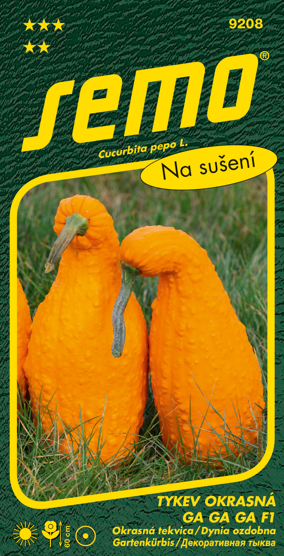 GA GA GA F1 SM (kód 9208) - hybridní odrůda tykve typu „crookneck“ vytvářející keříček. Plody jsou protáhle hruškovitého tvaru se zahnutým krkem. Mají žlutou barvu, pro dekorativní účely doporučujeme nechat plně vyzrát až do barvy oranžové. Mladé plody jsou jedlé, plně vyzrálé plody jsou určené pro dekoraci.