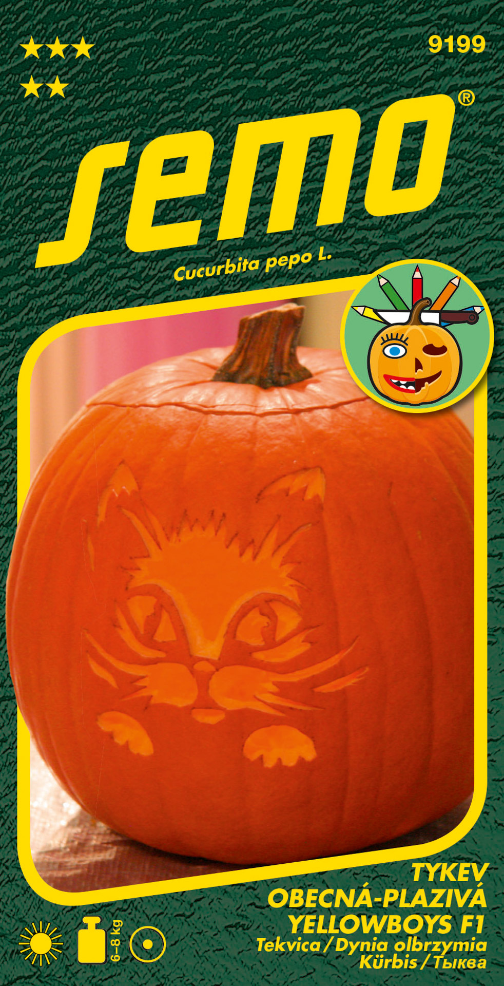 YELLOWBOYS F1 (Cucurbita pepo L.) - tykev vhodná pro HALLOWEEN. Plody o hmotnosti 8 - 10 kg jsou ploše kulaté, s výrazně oranžovou pokožkou s atraktivním žebrováním. Pokožka je dostatečně pevná, ale není tvrdá, takže se dobře vykrajuje. Vyniká vysokou tvarovou vyrovnaností plodů. Sytě oranžová dužina je vhodná pro kuchyňskou úpravu, zejména je vynikající na dýňové polévky.