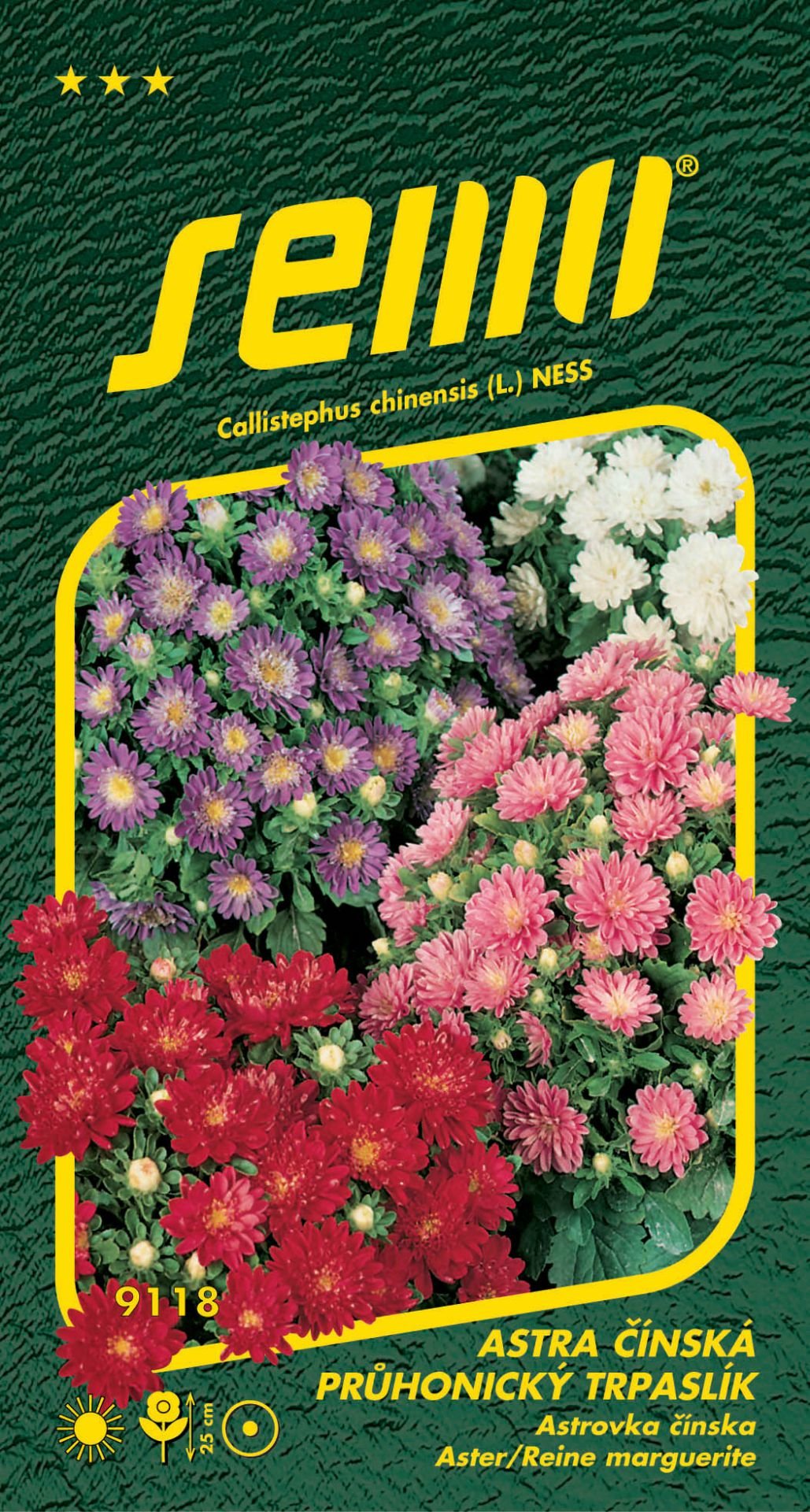 Callistephus chinensis ( L.) NEES / Astrovka čínskaPopis:Vzpřímeně rostoucí větvená letnička určená zejména k řezu a k záhonovým výsadbám. Listy jsou vejčité, zubaté. Vyžaduje slunné stanoviště. Nedoporučujeme přímé organické hnojení. Každoroční střídání stanoviště zabrání rozšíření fuzariózy (tzv. padání aster). V průběhu vegetace ošetřujeme proti mšicím, mimo přímého poškození sáním rozšiřují virová onemocnění. Výsev: březen - duben