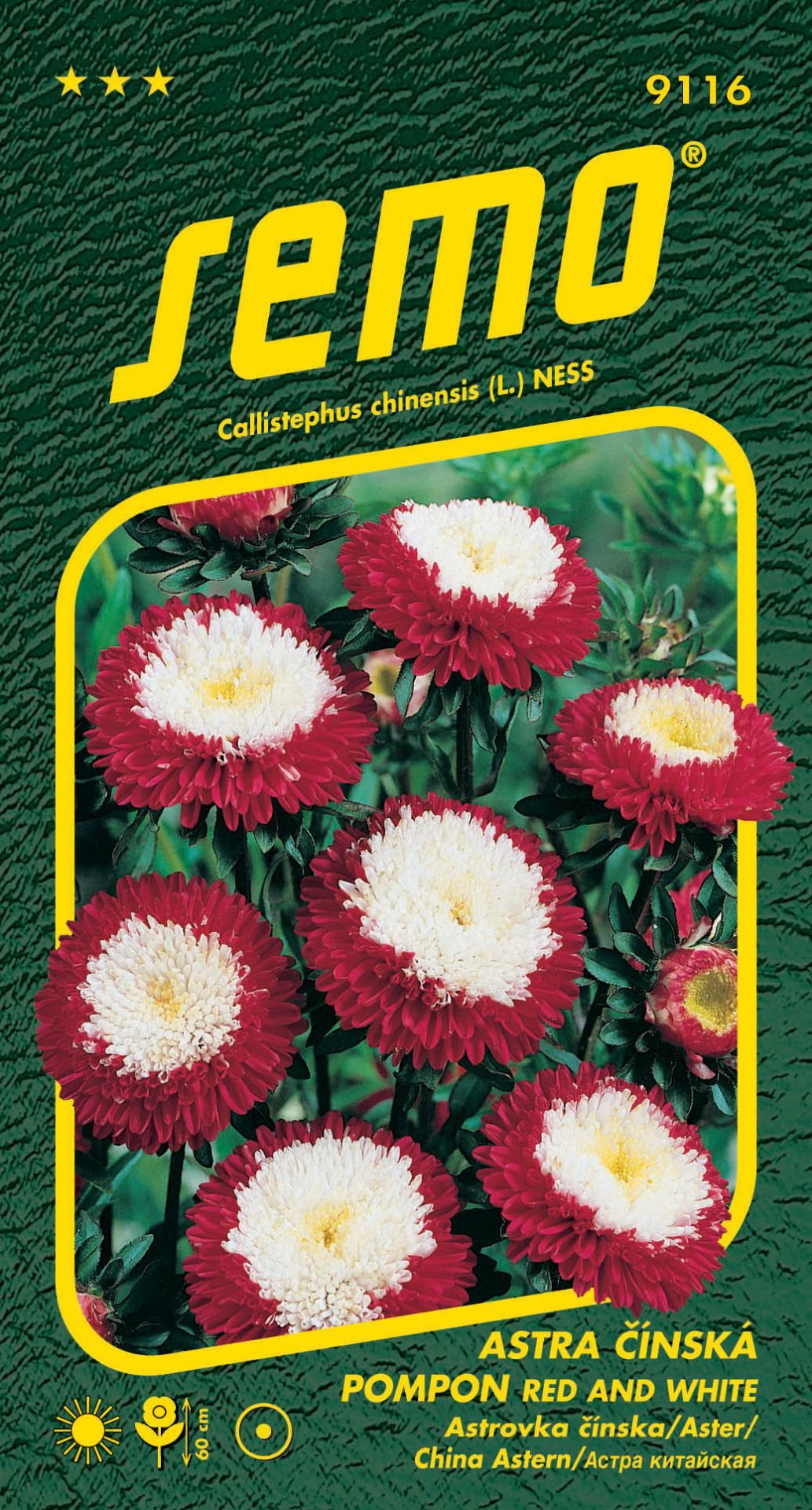 ODRŮDA: Astra čínská - Pompon red and white 0,5g (kód 9116)Popis:Vzpřímeně rostoucí větvená letnička určená zejména k řezu a k záhonovým výsadbám. Listy jsou vejčité, zubaté. Vyžaduje slunné stanoviště. Nedoporučujeme přímé organické hnojení. Každoroční střídání stanoviště zabrání rozšíření fuzariózy (tzv. padání aster). V průběhu vegetace ošetřujeme proti mšicím, mimo přímého poškození sáním rozšiřují virová onemocnění. Výsev: březen - duben