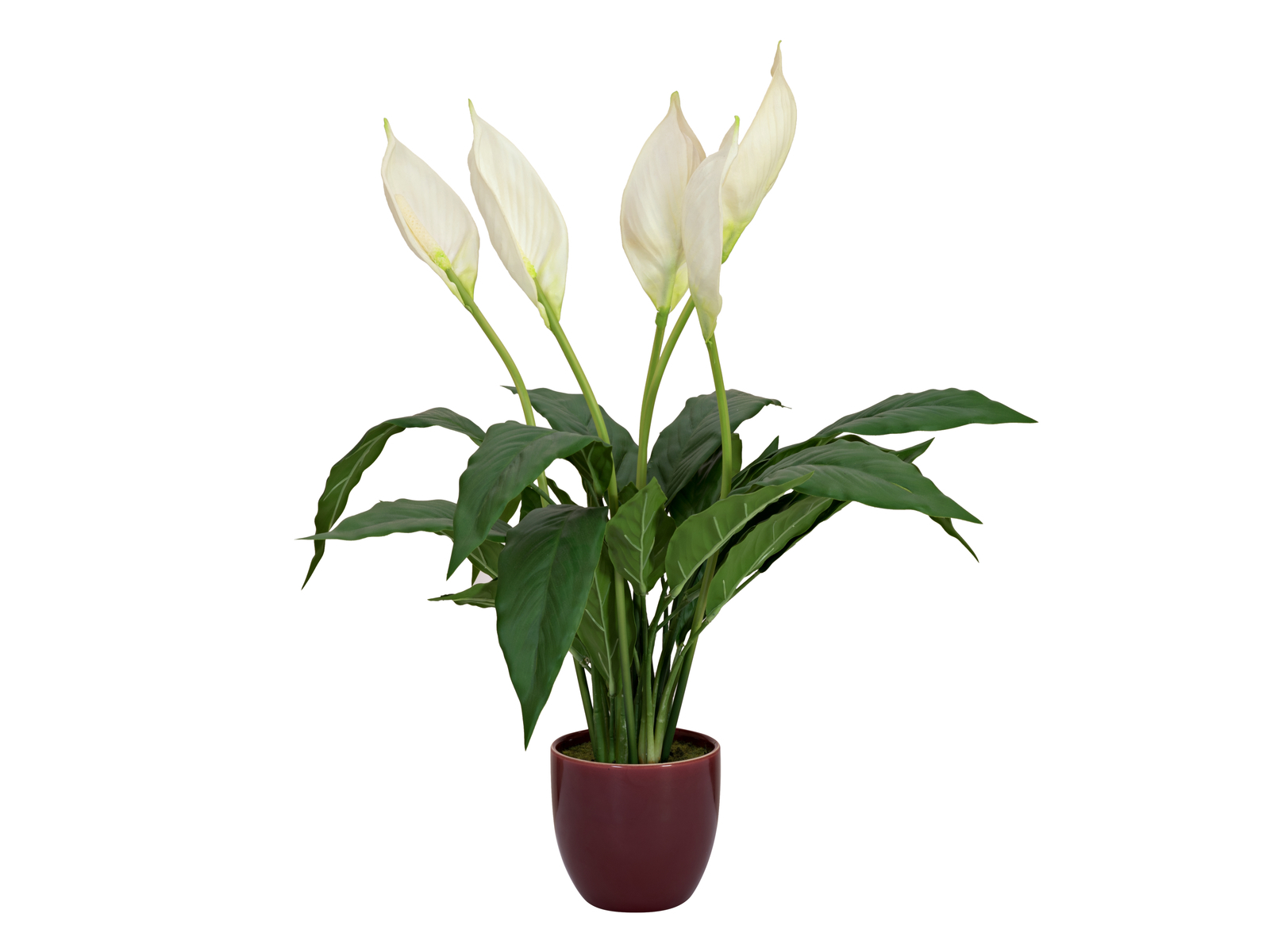 Tato elegantní pokojová rostlina je také známá jako mírová lilie, listová vlajka nebo spathiphyllum. Používá se v hotelech, obytných, kancelářských a komerčních prostorách. Stejně jako ve své přirozené formě má tato umělá rostlina několik výhonků blízko sebe. Ty tvoří keřovitě vyhlížející trs osamělé rostliny. Tmavě zelené lesklé listy poskytují obzvláště krásný kontrast k bílým až krémově zbarveným listenům. Pět z těchto dekorativních květenství vyčnívá vysoko z hustého olistění a působí velmi přirozeně díky své kvalitě na dotek. Umělá rostlina má celkovou výšku asi 60 cm a je dodávána v dekorativním keramickém květináči pokrytém umělým mechem. Těžkopádné zalévání již není nutné. Při dodání je květina připravena k použití. Vhodné I do chráněných venkovních prostor.