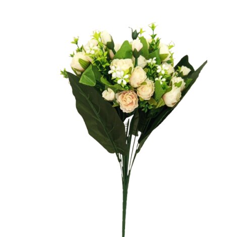 Růže - kytice poupat s přízdobou x 18 stonků; v. 44 cm; materiál plast a textil. Pěkné, bohatě kvetoucí.