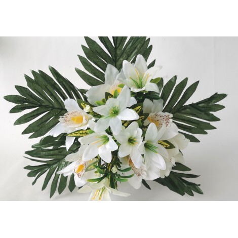 Kytice lilie, přízdoba a palmové listy, celkem 12 stonků (6 větších květů a 6 menších květů). V. 38 cm.