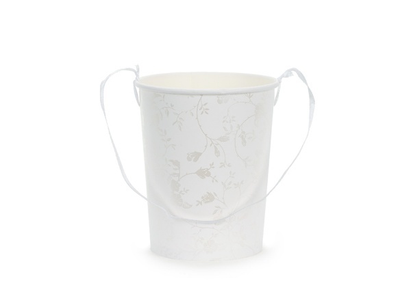 Vedierko má výšku cca 13 cm a zužujúci sa tvar s priemerom 9 až 11 cm. Je ozdobený jemnou perleťovou kvetinovou potlačou, ktorá pôsobí decentne, ale napriek tomu slávnostne. Biela saténová stuha s dĺžkou 50 cm dodáva celému doplnku romantický nádych.