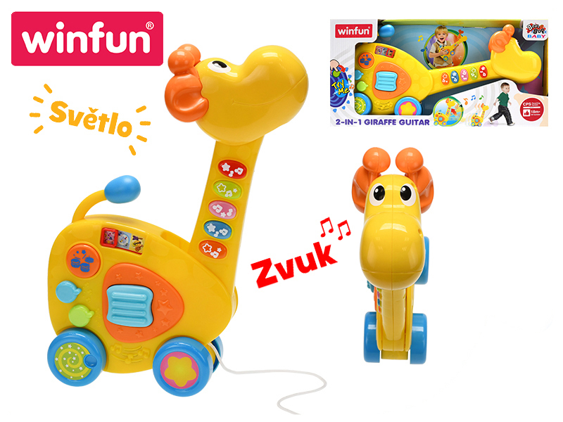 Máte doma malého hudebníka? Tak pro něj je tu žirafa a kytara 2v1 o velikosti 39cm, která poslouží jako hračka, ale zároveň bude zdokonalovat jeho hudební vlohy. Žirafa lze táhnout za sebou na provázku, má klávesy pro hrání a nahrané různé další zvuky a melodie. Vše je doladěno i světelnými efekty.