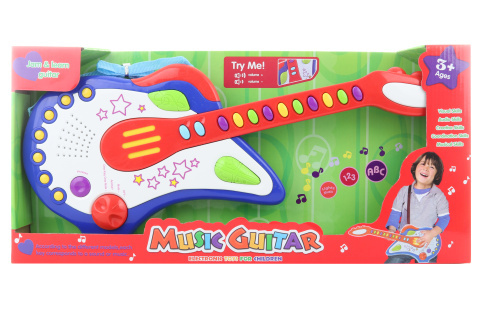 Tato kytara svítí a přináší různé zvukové efekty včetně klasických tónů a zvuků zvířátek, což dětem umožňuje kreativně objevovat svět hudby a zvuků hravou formou. Napájení zajišťují 3 AA baterie (nejsou součástí balení), které zajišťují pohodlí a jednoduché používání bez nutnosti připojení k elektrické síti.