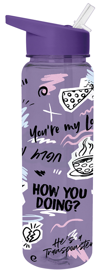 Fialová plastová láhev na pití s grafickým potiskem Phrases ze seriálu Přátelé.