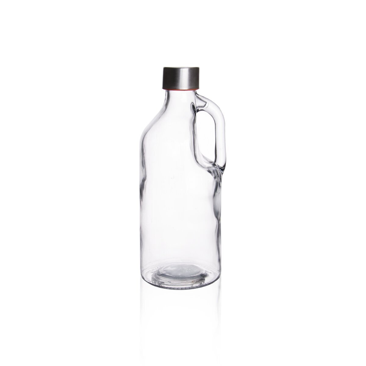 Láhev s uchem a uzávěrem na závit. Materiál: sklo, kov, plast, silikonové těsnění. Rozměry: objem 0,55 l, pr. 7,5 cm, v. 20 cm.
