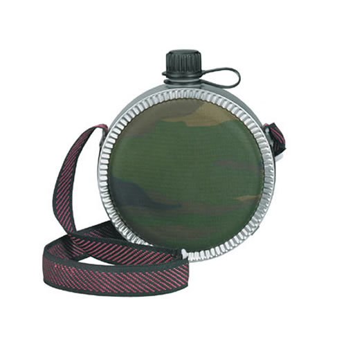 Malá polní láhev pouštního typu o objemu cca 0,75 l. Plastový vnitřek, pocínovaný vnější obvod a látkový potah z bočních stran. Průměr cca 18 cm, šířka 9 cm. Nastavitelný ramenní popruh. číst celé
