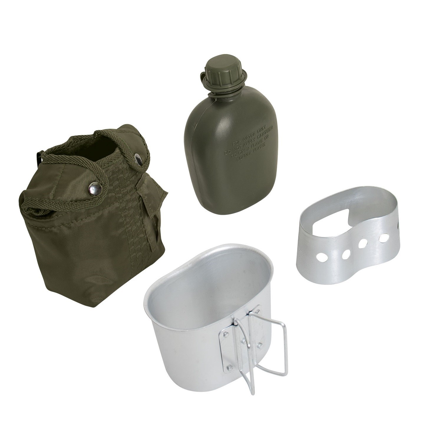Čtyřdílný set - 1. plastová láhev o objemu cca litr, 2. hliníkové pítko se skládacíma uchama, objedm 0,7 litru, 3. stojan/vařič pod pítko, hliníkový, 4. nylonový obal na celou sadu, v přední části s kapsičkou.