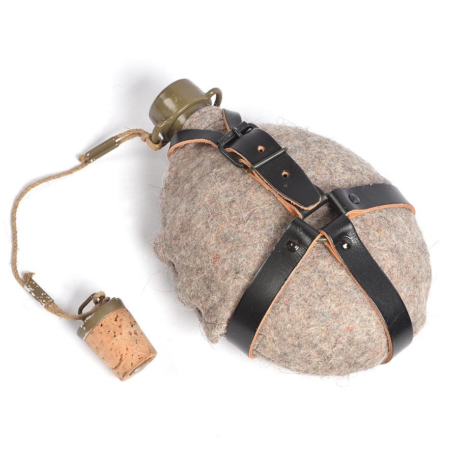 Česká polní láhev s filcovým potahem. Lahev včetně koženého řemení. Zapínání potahu na cvoky. Korkový uzávěr.