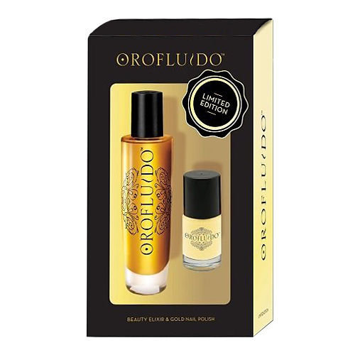 **Orofluido Elixir** kazeta pro všechny typy vlasů. **Složení kazety**: **Beauty Elixir 50ml - Tekuté zlato** Obsahuje směs tří hodnotných přírodních olejů, které blahodárně působí na Vaše vlasy. Vhodný pro všechny typy vlasů. Můžete jej nanést na vlhké i suché vlasy. **Obsahuje tři cenné přírodní oleje**: _Arganový olej_ Tekuté zlato pro vaše vlasy, který nám příroda daruje z pecek plodů argánie trnité. Arganový olej obsahuje velké množství vitaminu E a mastných esenciálních olejů, má podobné složení jako naše pleť. Tento olej dodá vašim vlasům sílu, ale zároveň mimořádnou lehkost a úžasnou hebkost. _Lněný olej_ Cenný olej z lněných semínek přináší vašim vlasům nádherný lesk, protože ihned po ošetření začnou zachycovat a odrážet světlo. Lněný olej zacelí a zjemní vlasové kutikuly, je nepostradatelným pomocníkem při sjednocení a úpravě účesu. _Olej ze šáchoru jedlého_ Olej je bohatý na nenasycené mastné kyseliny a tokoferoly, které chrání vaše vlasy proti působení volných radikálů. Olej ze šáchoru jedlého - pro vlasy jemné jako hedvábí, objemné, hladké, pružné a snadno upravitelné. Delikátní, vanilkové aroma s tóny pryskyřice vám připomene fascinující svět orientálních vůní. Olejíček ošetří všechny typy vlasů, nemusíte jej oplachovat. **Použití**: Stačí vetřít dlaní ruky několik kapek do vlhkých vlasů vysušených ručníkem. Množství oleje si určíte sami podle typu, délky a síly vašich vlasů. Lze také použít na suché vlasy pro rychlou úpravu a lesk: hedvábná, snadno vstřebatelná textura nezanechá zbytky ani vlasy nezatíží. Po aplikaci olej neoplachujte. **Aplikace do vlhkých vlasů**: