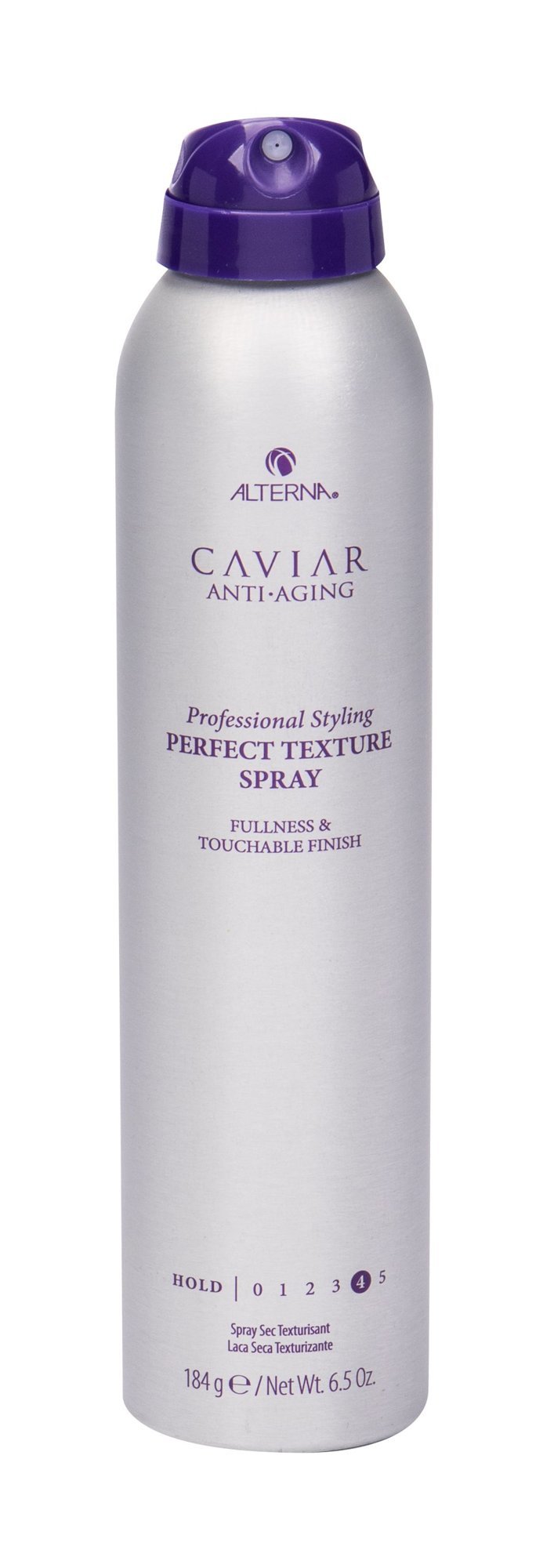 Vlasový sprej **Alterna Caviar Anti-Aging Perfect Texture**. Suchý multifunkční vlasový sprej Alterna Caviar Perfect Texture Finishing Spray dodává lehkou fixaci, texturu a objem jakámukoli stylu. Vlasy se neslepují a zůstávají krásně vzdušné. Účinky: · chrání před UVA a UVB zářením · chrání barvu před vymýváním · zvyšuje plnost jemných vlasů · zanáchává vlasy silné, hladké a lesklé · lehké až střední tužení **Použití**: Aplikujte na suché vlasy po celé jejich délce ze vzdálenosti 20-30 cm.