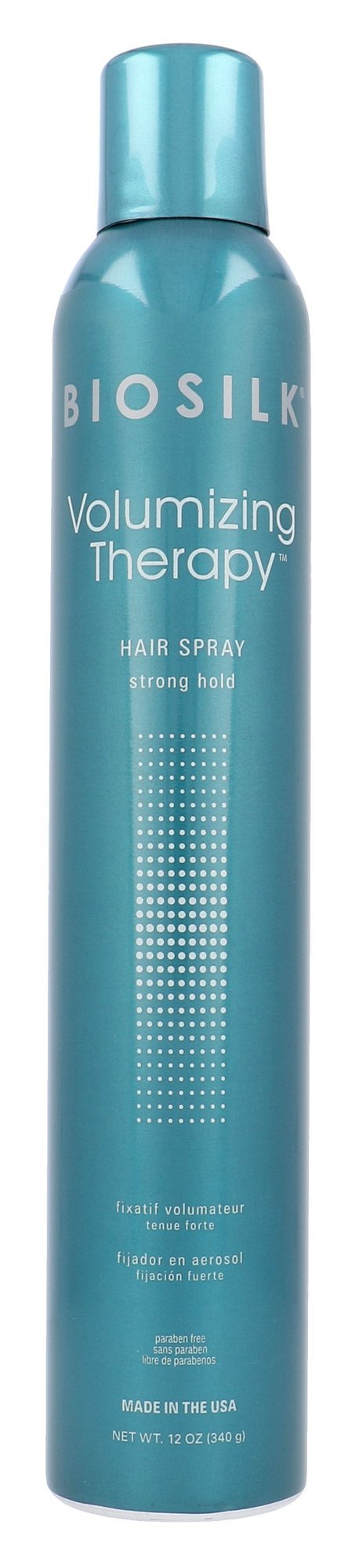 Lak na vlasy **Biosilk Volumizing Therapy**. Lak Biosilk Volumizing Therapy dodá vlasům extra objem a lesk po celý den. Díky výtažkům z hedvábí a rýže vlasy posiluje a vyživuje. Váš účes bude zafixovaný bez jakéhokoli zatížení. Sprej zároveň chrání vlasy před škodlivým UV zářením. **Použití:** Aplikujte ze vzdálenosti cca 35 cm na suché vlasy. Pro zafixování účesu při zachování dynamiky pohybu aplikujte z bezprostřední blízkosti. Pro získání objemu nastříkejte ke kořínkům.
