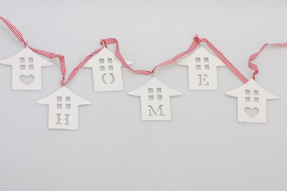 Girlanda domeček s nápisem HOME, barva bílá. Rozměr domečku: 8 x 8,5 cm, celková délka 105 cm. číst celé