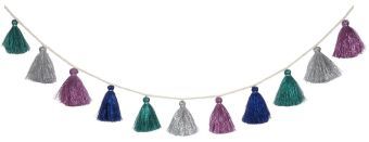 Dekorative Girlande mit 16 großen Quasten aus Metallikfäden, fertig zum Aufhängen auf einer Bio Baumwollkordel , Länge 3 m, Verpackt in einem Stoffbeutel mit Kordelzug číst celé
