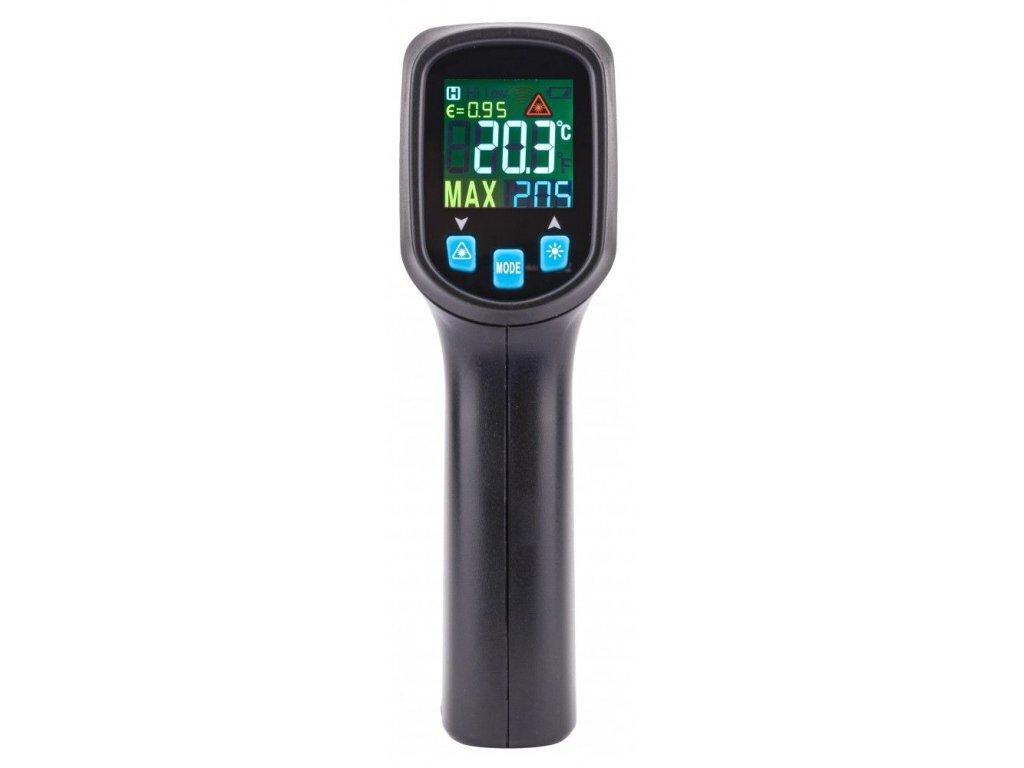 Infračervený měřič teploty/pyrometr je zařízení pro bezdotykové měření teploty pomocí infračerveného záření. Měření pohybujících se předmětů, těžko přístupných nebo na dotek nebezpečných, v potravinářském průmyslu, kontrola elektrických zařízení, kontrola klimatizačních a topných systémů, chlazení, sušení, v automobilovém průmyslu a mnoho dalšího. Přístroj se vyznačuje velmi vysokým teplotním rozsahem (-50 ~ 600 °C) a přesností měření, jednoduchým ovládáním, moderním a ergonomickým pouzdrem. Zařízení se snadno používá, stačí namířit na měřený předmět a stisknout spoušť, výsledek se zobrazí na průhledném, podsvíceném, barevném LCD displeji. Zařízení nevyžaduje manuální kalibraci. Napájení pomocí 2 ks baterie AAA.