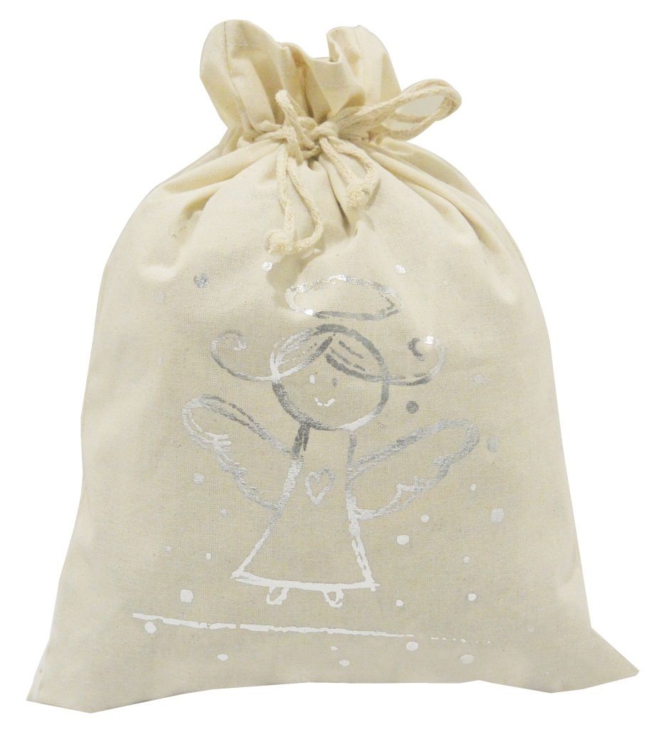 Originální a praktické řešení pro balení dárků i skladování - látkový pytlík se stříbrným andělem. Zajistěte svým dárkům nebo věcem elegantní a stylový obal, který zaujme na první pohled.